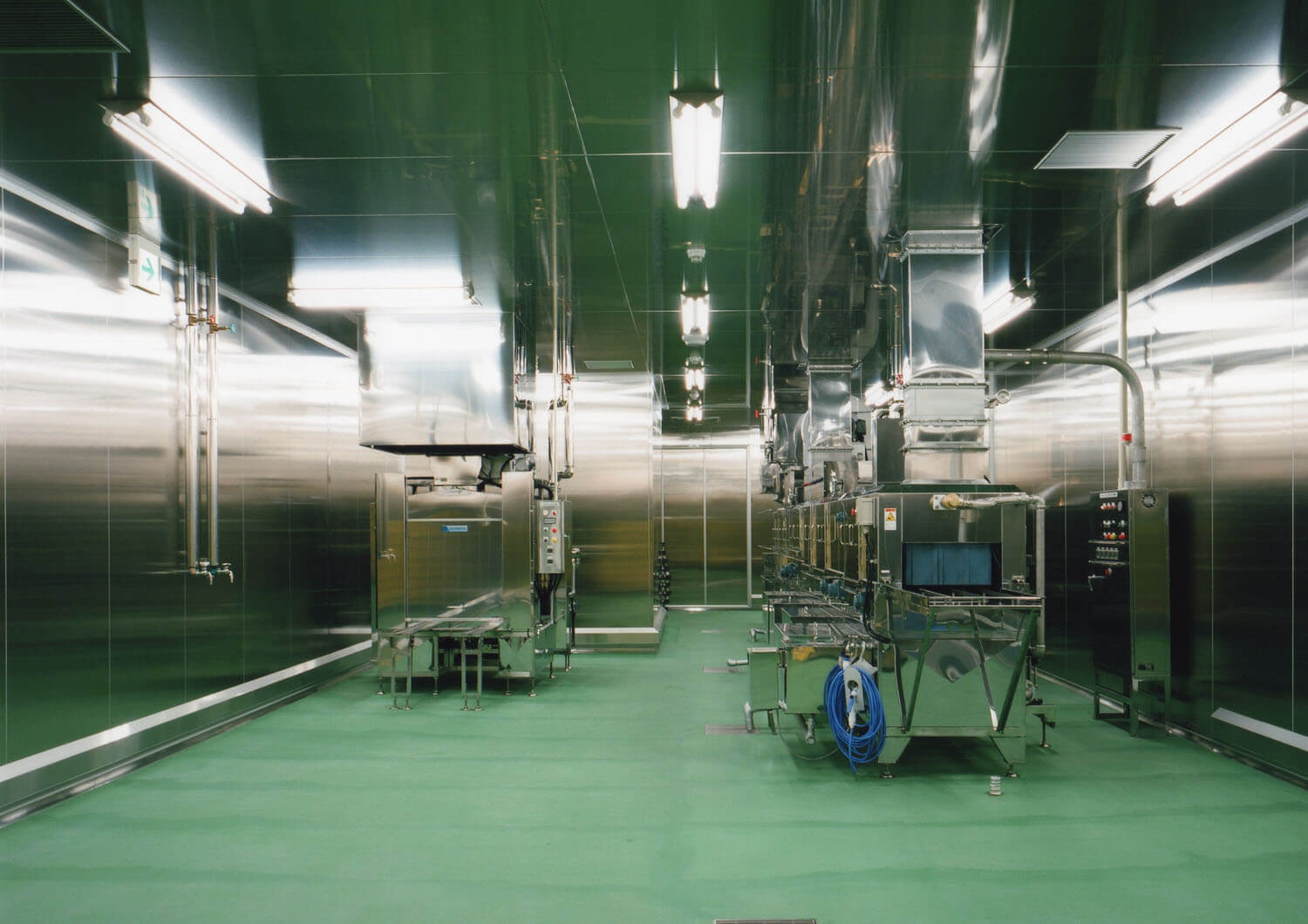 【工場計画のポイント】 本工場はコンビニエンスストアへの弁当製造、供給を行う食品工場です。当該敷地は規模に余裕があることから、生産施設をすべて1階に配置することができました。その結果、製造諸室を受け入れ、保管、下処理、加工、盛り付け、仕分と配置し、原材料の受け入れから製品の出荷までの流れの一方通行が可能になりました。